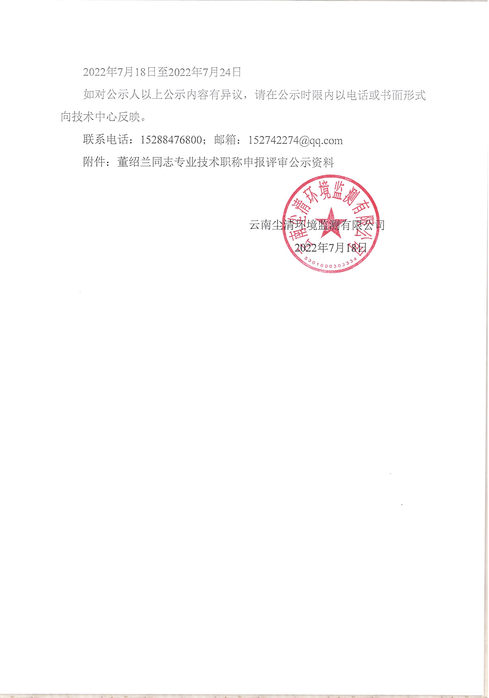 關(guān)于董紹蘭同志申報助理工程師專業(yè)技術(shù)職稱的公示(公示時間:2022年7月18日至7月24日)