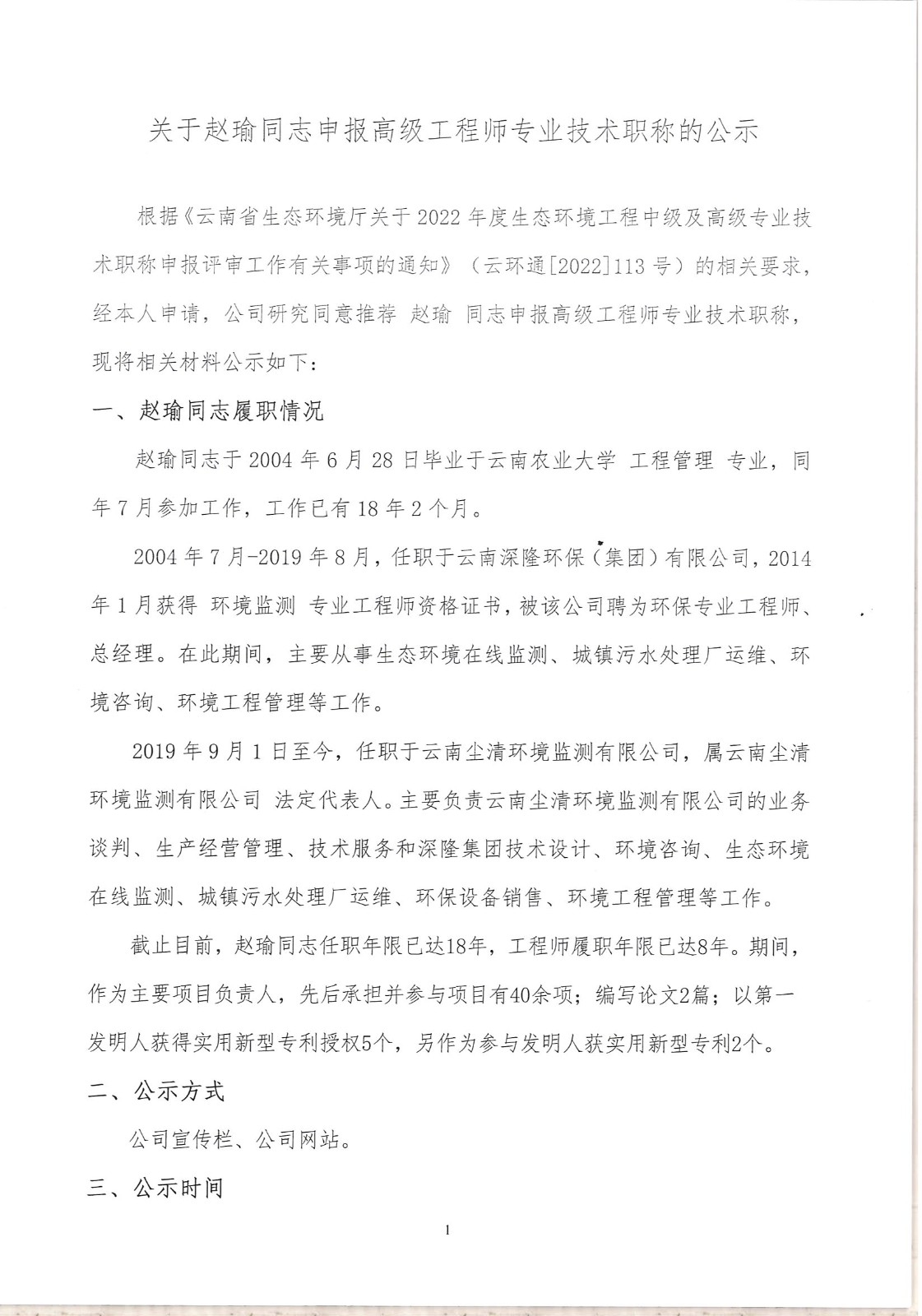 關(guān)于趙瑜同志申報(bào)高級(jí)工程師專業(yè)技術(shù)職稱的公示(公示時(shí)間:2022年8月29日至9月3日)